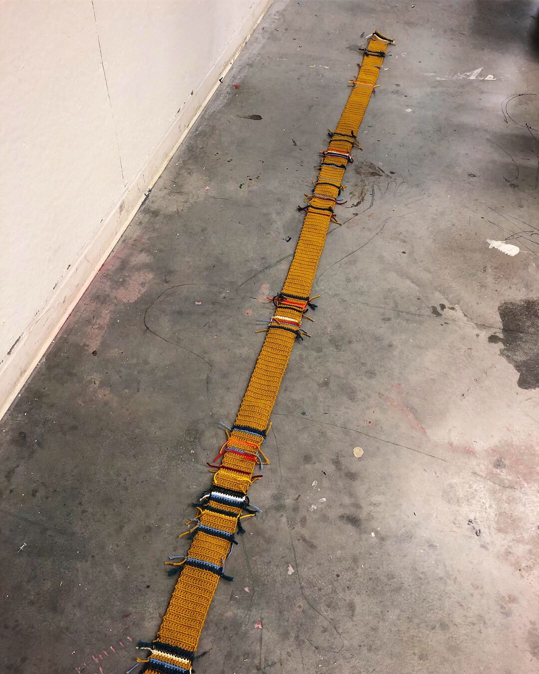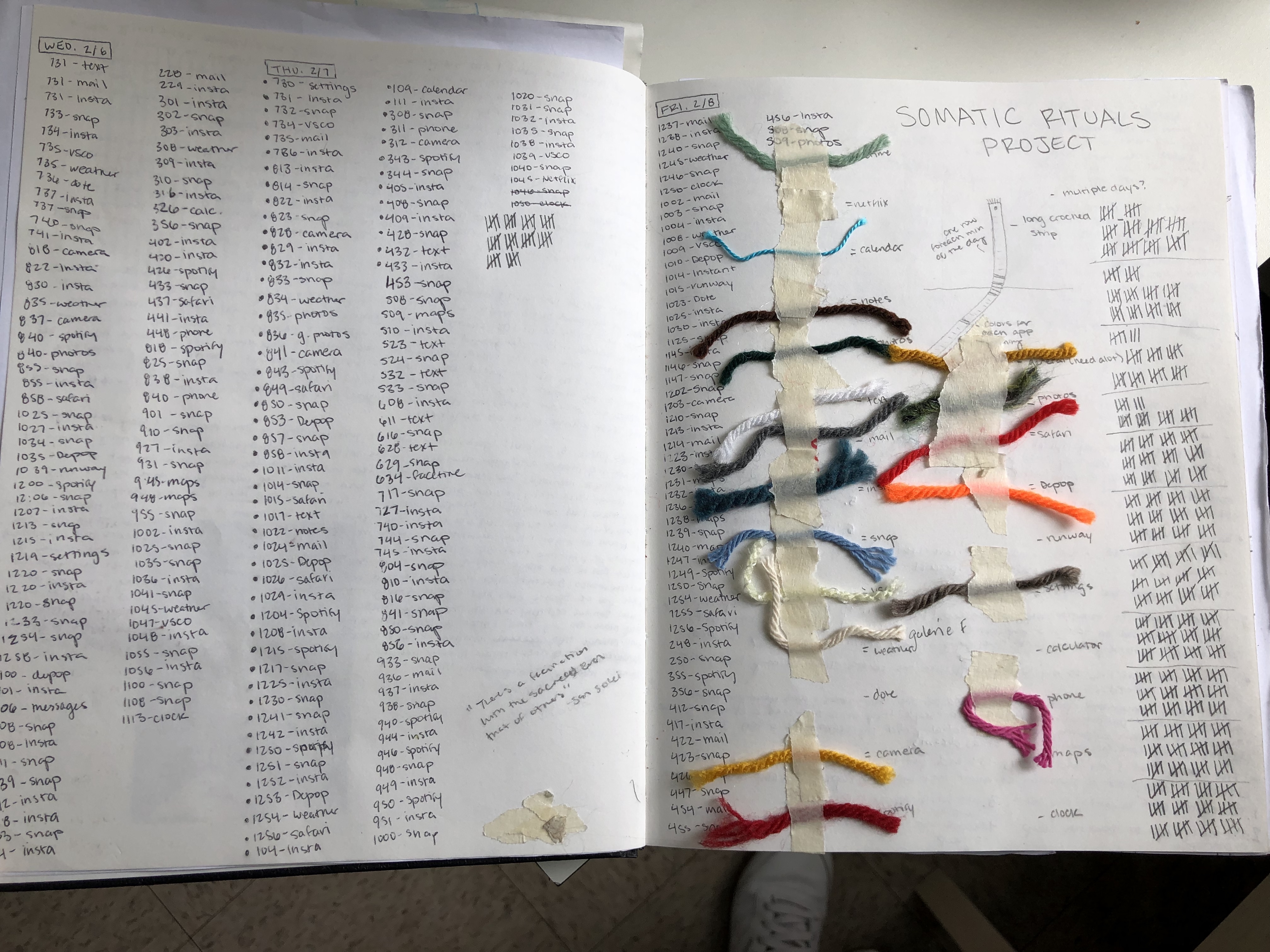 How do you visualize all of the apps you open in a day? This was the question I was trying to answer with this project. Using my sketchbook and a sharp memory, I recorded every app I opened and what time I opened them for a 24 hour period. Each app was assigned a color. One line of crochet = 1 minute of the day. There are a lot of lines here but maybe not quite all 24 hours worth.... but who’s counting anyways!